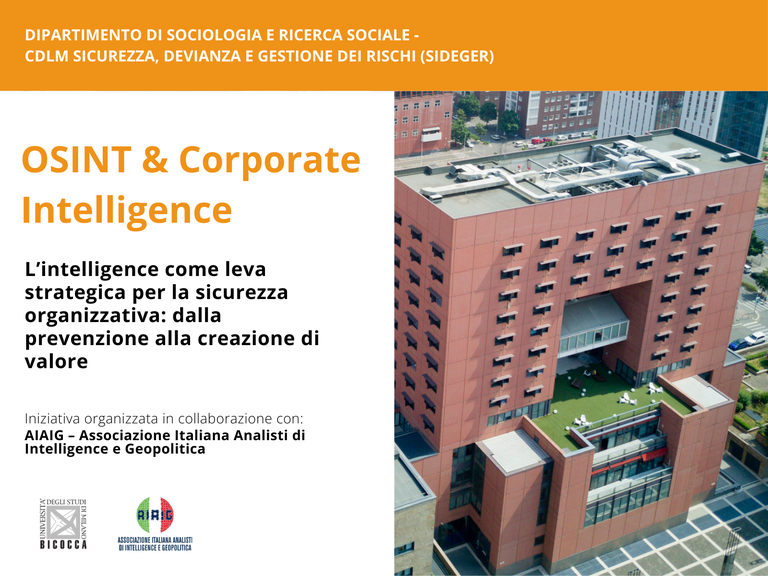Iniziativa organizzata dal Dipartimento di Sociologia e Ricerca Sociale nell'ambito del Corso di Laurea Magistrale in Sicurezza, Devianza e Gestione dei Rischi in collaborazione con AIAIG – Associazione Italiana Analisti di Intelligence e Geopolitica.